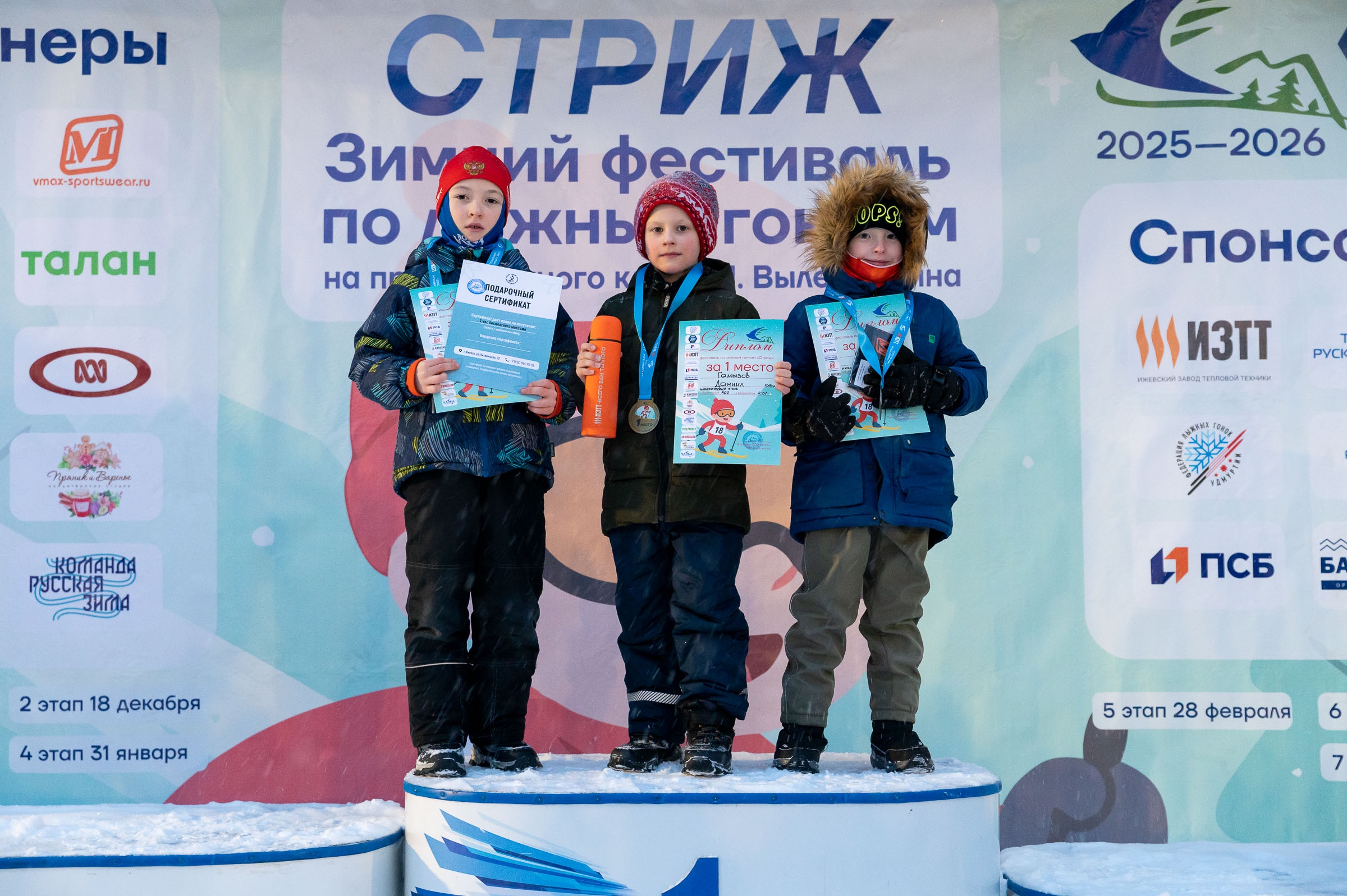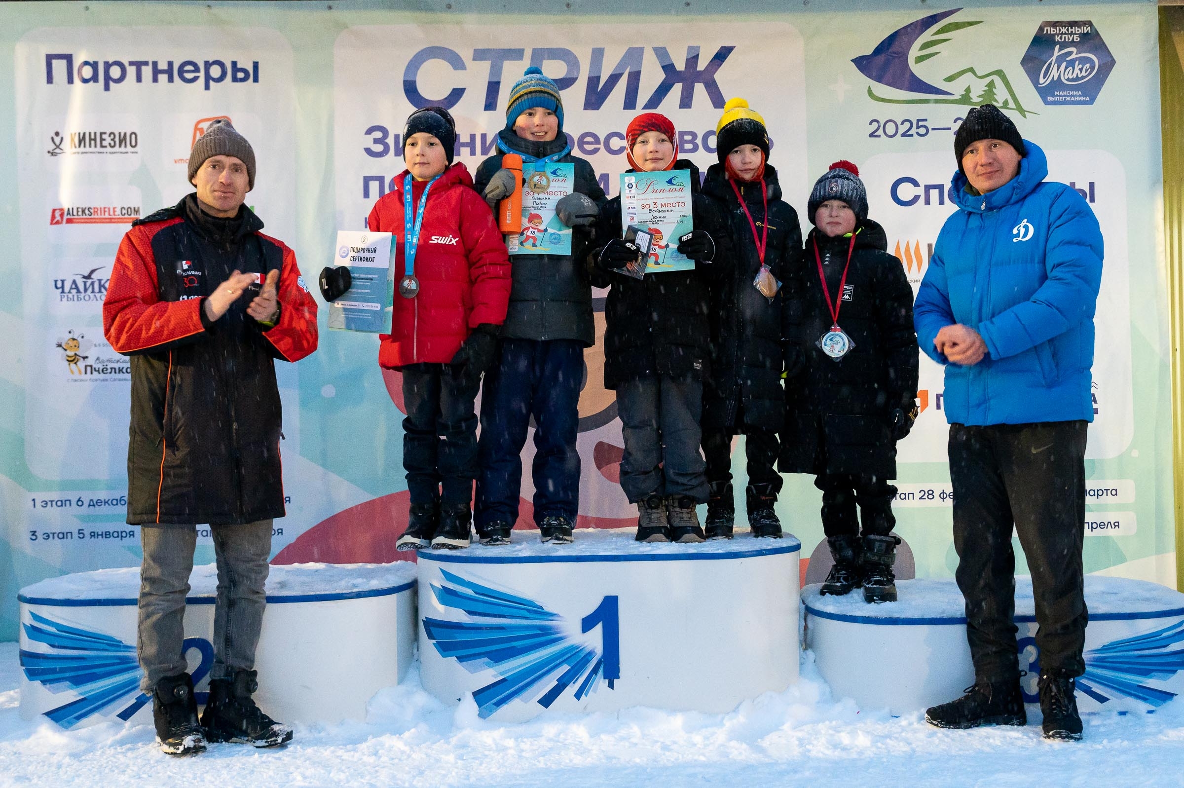 Юные спортсмены соревновались в гонках классическим стилем без палок. По итогам стартов места на пьедестале почета распределились следующим образом: